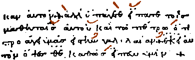 As the centuries passed, neuming became more and more complex, adding metrical notations and, eventually, ledger lines. The picture below (a small portion of chapter 16 of Mark from the tenth century manuscript 274) shows a few neumes in exaggerated red. In this image we see not only the acutus and the gravis, but such symbols as the podatus (the J symbol, also written !), which later became a rising eighth note.