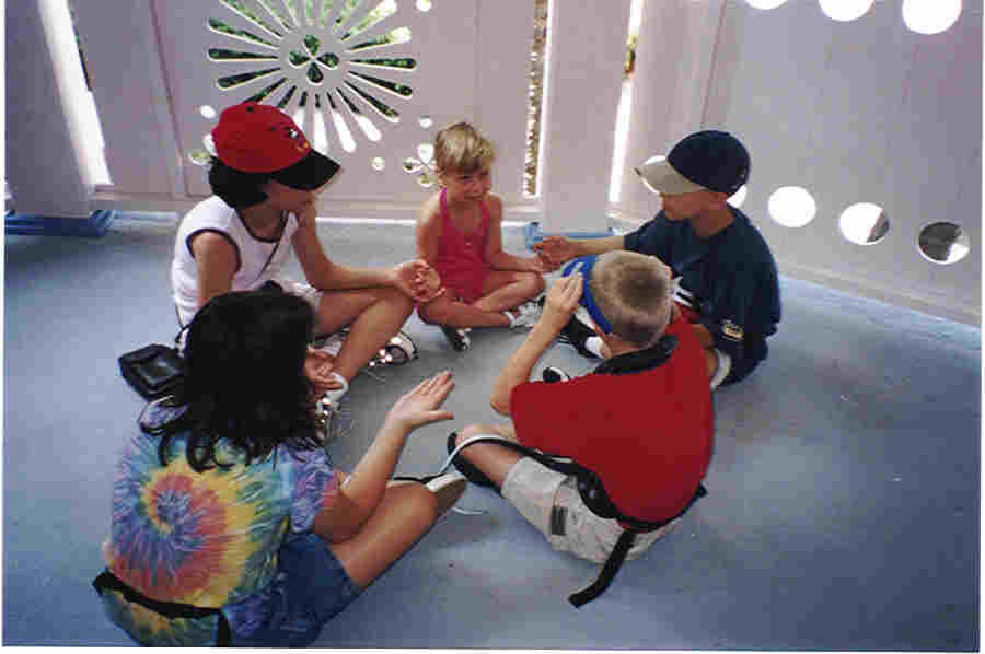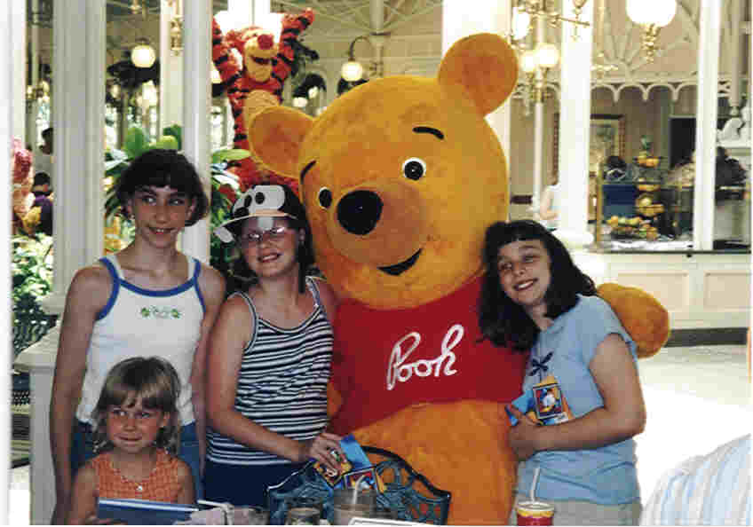Amanda, Joelle, Joe, Jeff, and Michelle play a game at the hotel. Karen and Chris with Tigger at Lunch. Amanda, Katey, Michelle, and Joelle with Winnie the Pooh. Mark and Michael with Piglet. Penny flying with Michael and Joelle (running the controls). Bill wearing a Winnie the Pooh robe that Penny found (standing on right).