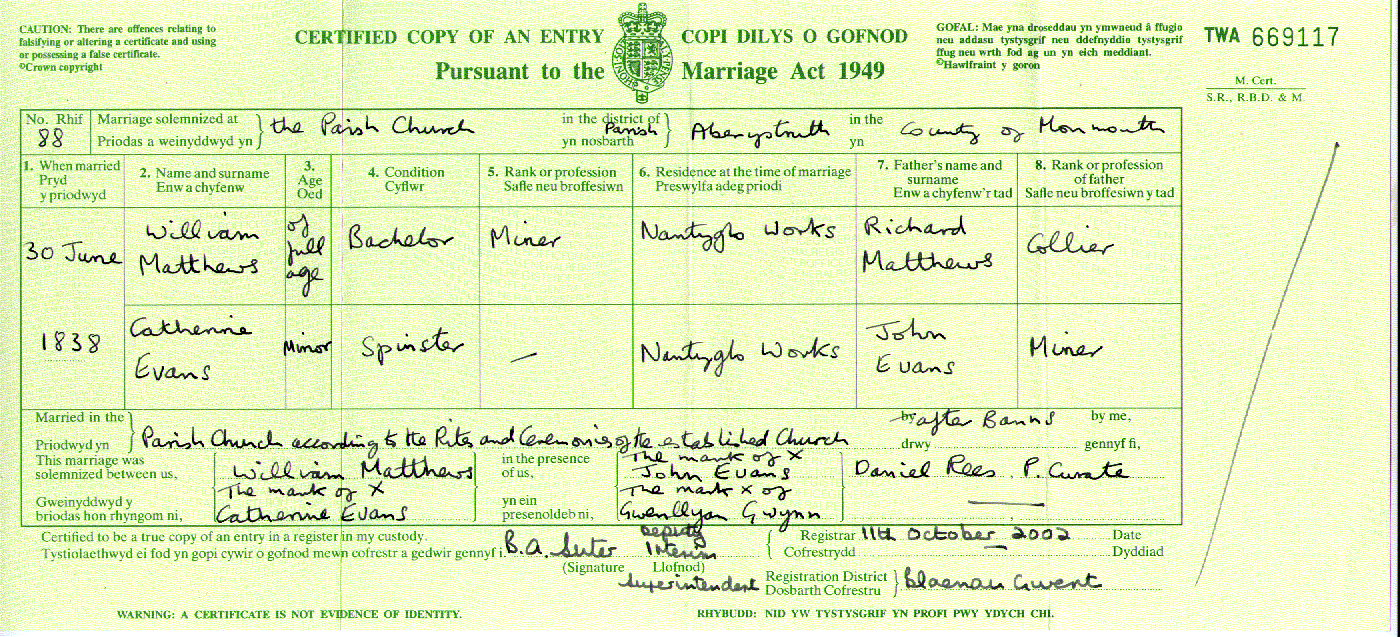 William was born in Castleton, Monmouthshire, Wales in February of 1817. The year 1819 is incorrectly recorded on his gravestone. There is some question about this date as the 1851 Welsh census and the "Queen of the West" passenger list also of 1851, show William as aged 32. However, his marriage record for June 30, 1838 shows him "of full age" giving a birth year of 1817. The 1900 census, enumerated by his son Thomas J., gives a month of February and the year 1817. Other census enumerations do not indicate a consistent birth year. The earliest document which indicates 1817 is his baptismal record.